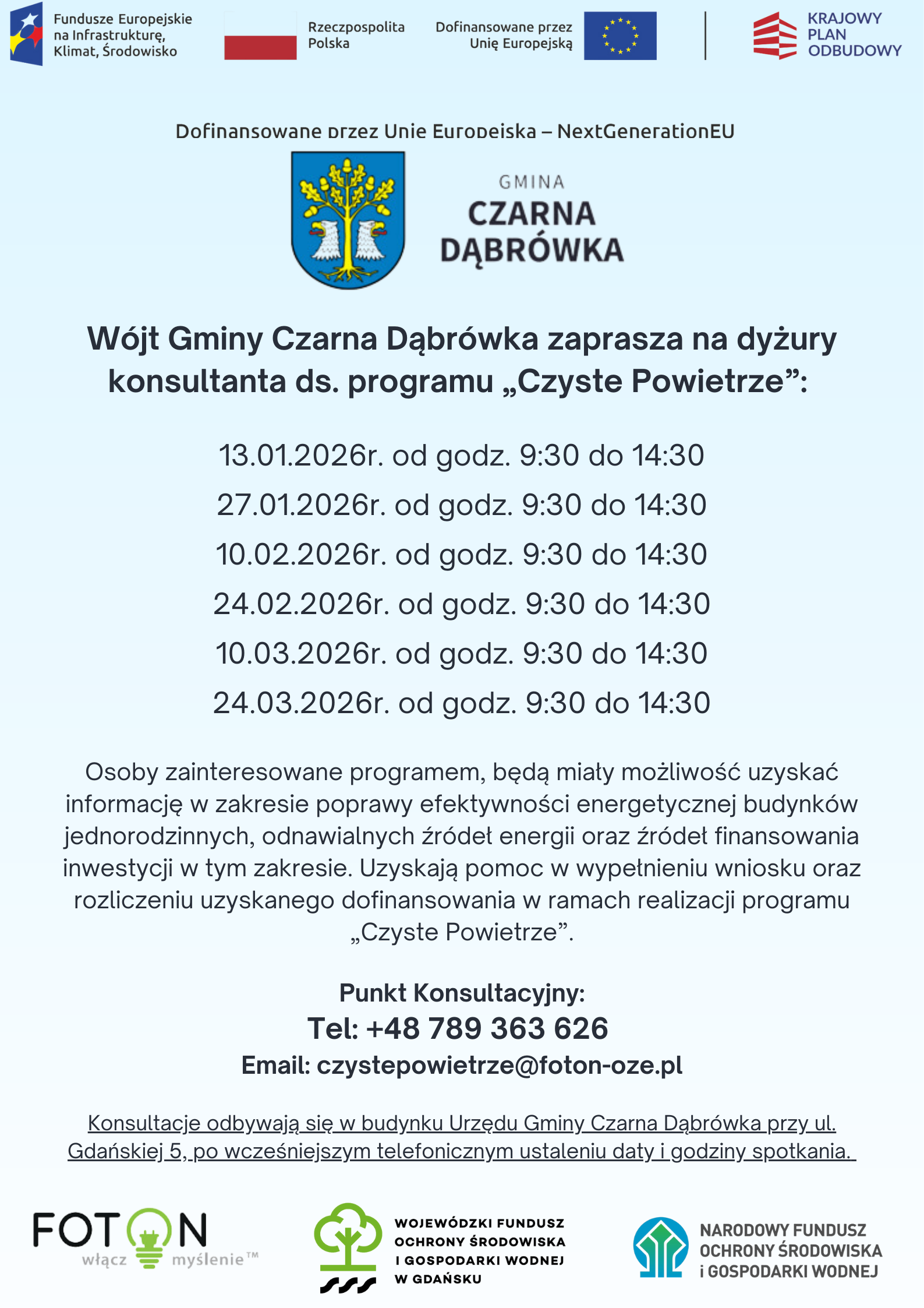 Wójt Gminy Czarna Dąbrówka zaprasza na dyżury konsultanta ds. programu „Czyste Powietrze”